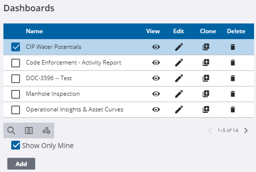 NOTE: The Own column shows who created the dashboard.