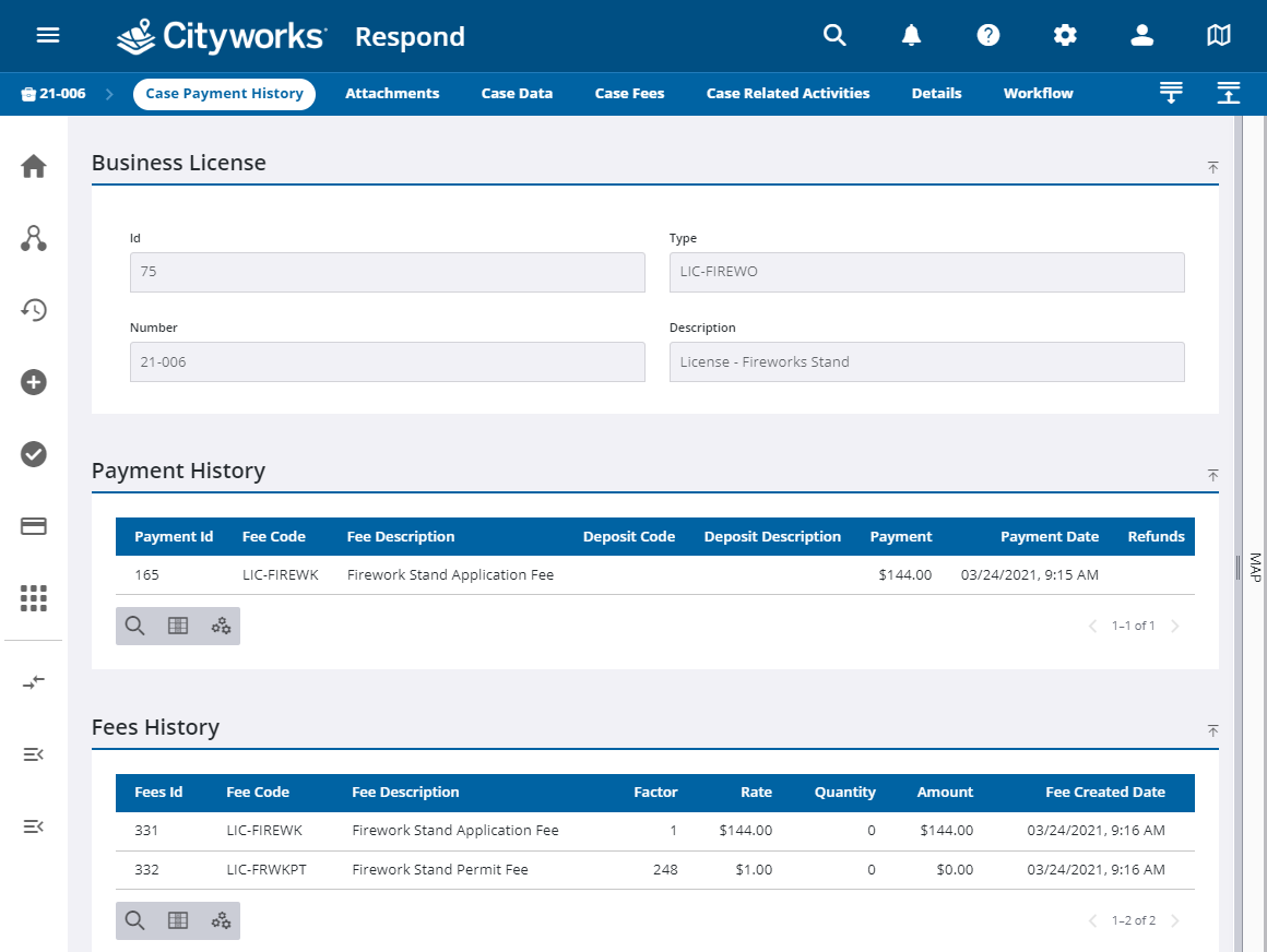 • The case status must be set to renewal to load the history of payments and fees. See Renew a License for more information.