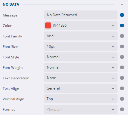 - Set up the No Data section on the Properties tab in the event that no data is returned on the report.