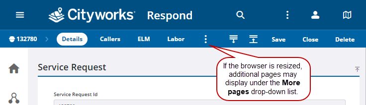 Additional pages within the service request can be selected from the activity toolbar.
