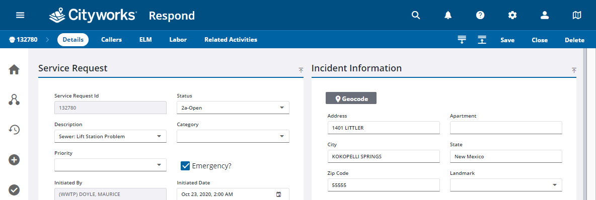 NOTE: The panel names appearing on the Service Request page are the default labels, but may be changed using Cityworks Style. See the Style 2.0 Guide for more information.