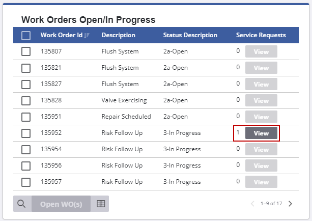 Some widgets, such as a table widget, allow you to view related information (i.e., child data), like showing related work activities or work order tasks for a work order.