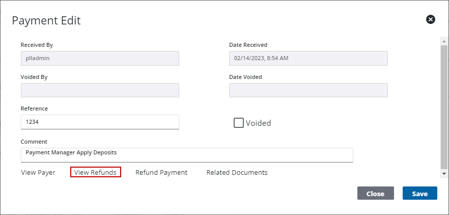 1. Select the Voided check box to void any refunds made in error. Refunds should be voided instead of removed to preserve the history of the cash flow and accurately identify why changes were made to the transaction.