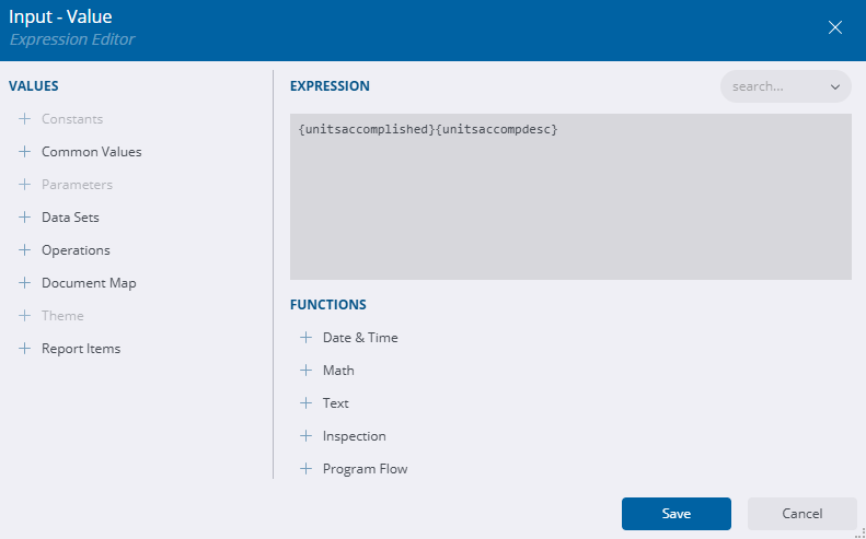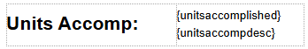 Expressions can be written to link two fields into one field, for example the number of units accomplished and the description.