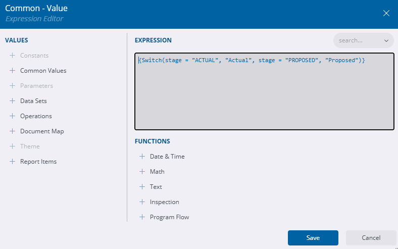 - Enter an expression, for example: {Switch(stage = "ACTUAL", "Actual", stage = "PROPOSED", "Proposed")}