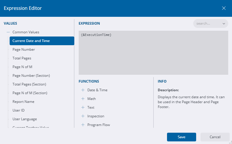 - Expand Common Values and double-click Current Date and Time to add it to the Expression.