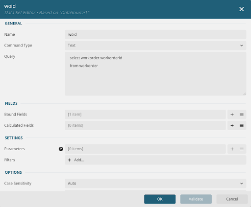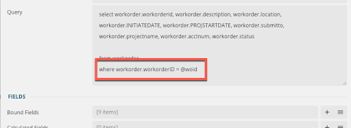 - In the Query field, add a "where" statement: where workorder.workorderID = @woid.