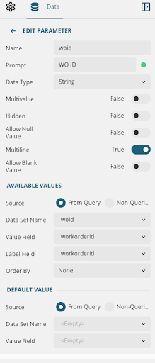 - Double-click the parameter name you created, for example workorderid.