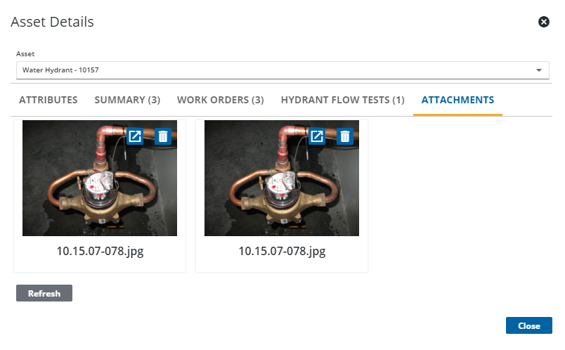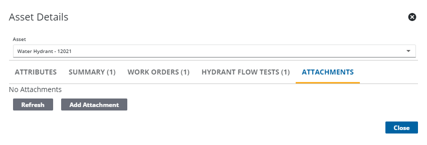 GIS attachments can be viewed on the Attachments tab. In order for them to display, the Cityworks site must be configured with Single Sign-on and the asset layer needs to come from a feature service that has attachments enabled. GIS attachments can viewed for features or related objects.