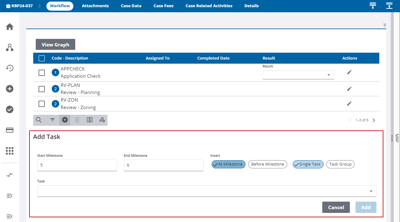 You can add a task from the Workflow panel on the case summary page, from the Workflow page, or using the graph.