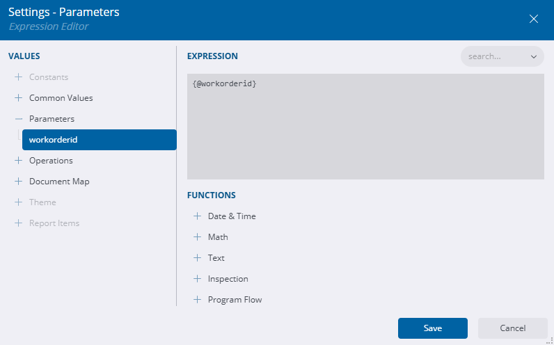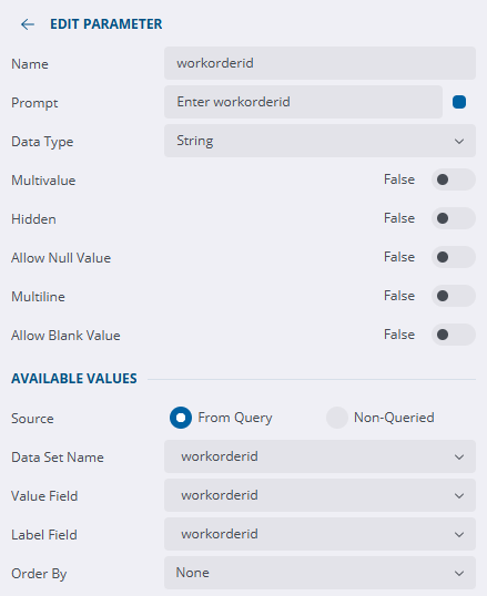 - Change the Parameter Name to your parameter name, for example workorderid.