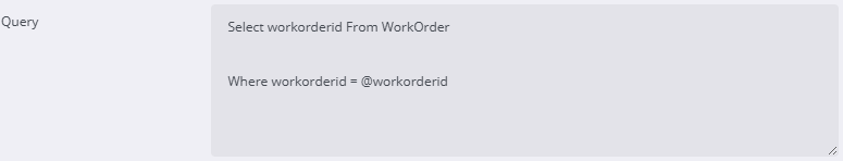 - In the Query field, add a "where" statement: where workorder.workorderID = @woid.
