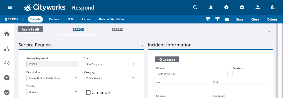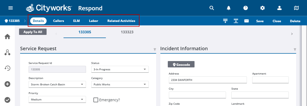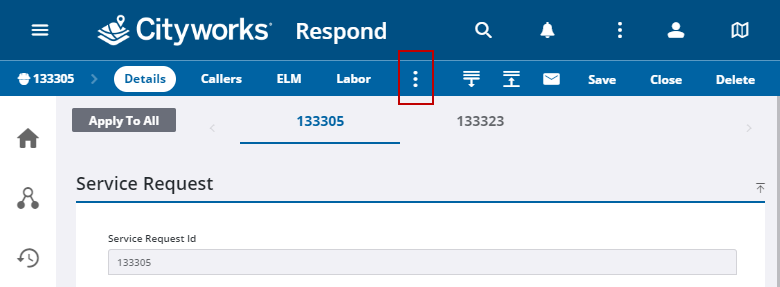 Additional pages within the service request can be selected from the activity toolbar.