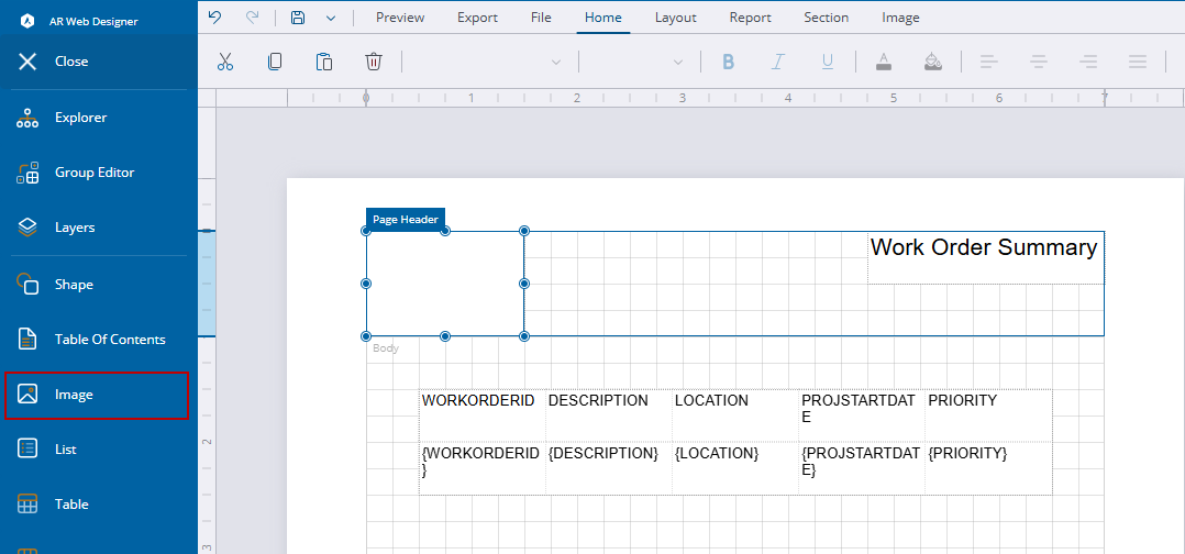 - Select Image from the left side and drag it where you want to insert an image, like the header with your company's logo.