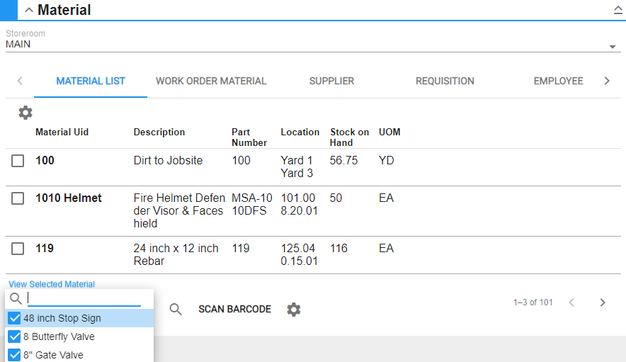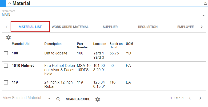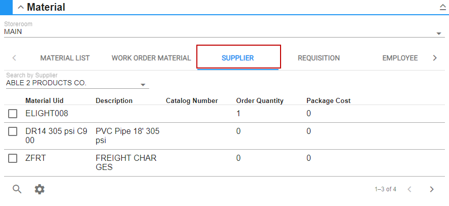 NOTE: The Material List and Material Search tabs appear when you select any transaction on the Storeroom toolbar. The Work Order Material, Supplier, Requisition, and Employee tabs only appear when specific transactions are selected.