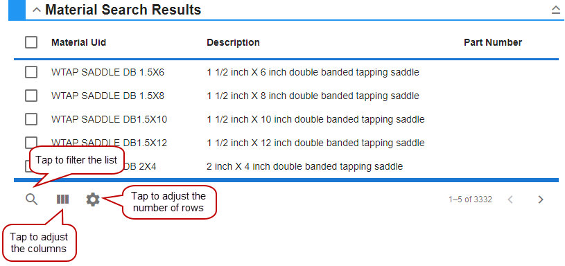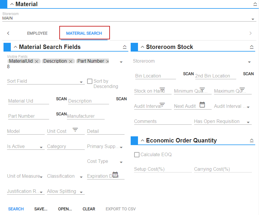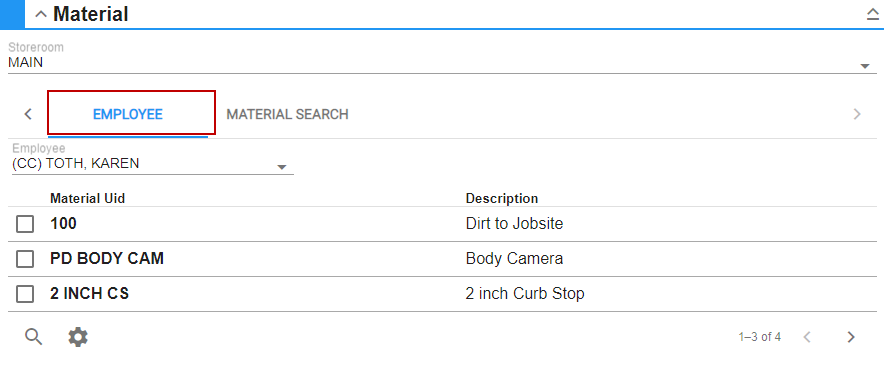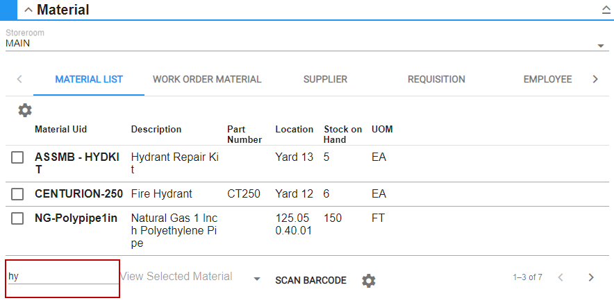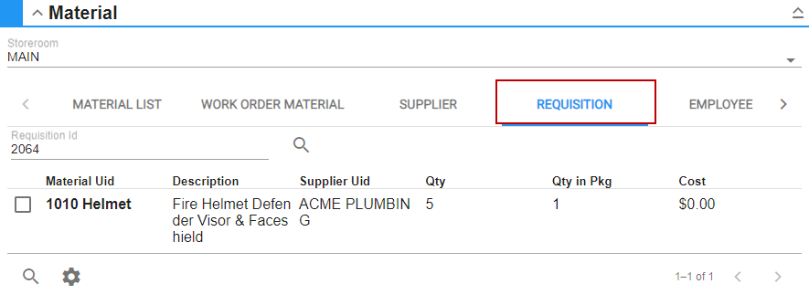 You can search materials on the Material panel by using the Material List, Work Order Material, Supplier, Requisition, Employee, or Material Search tabs. Materials can then be searched on each tab using the search icon.