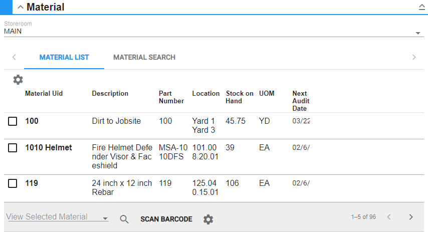 1. On the Material panel, select a Storeroom from the drop-down list. This changes the list of materials. Materials can only be selected from one storeroom at a time.