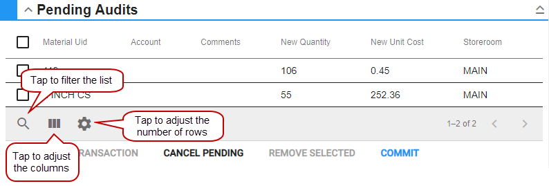 • Tap the gear icon to adjust the number of rows shown in the panel. The number set in this panel will persist on all other transaction pages for the corresponding pending material panel.