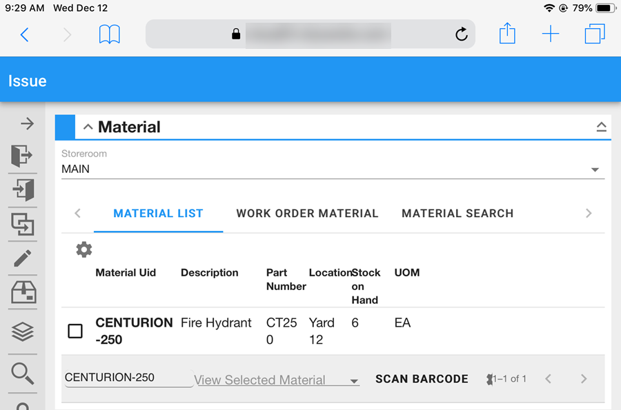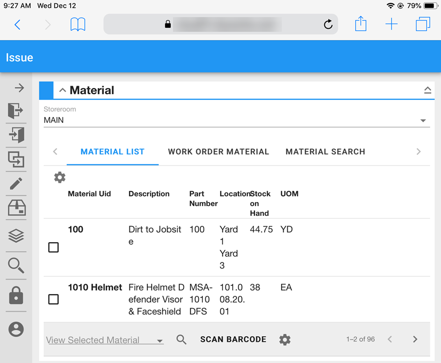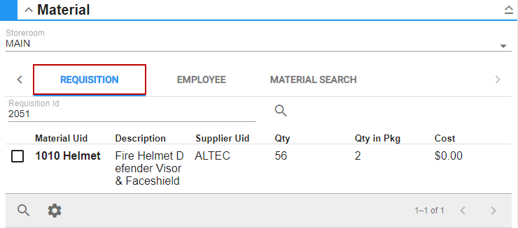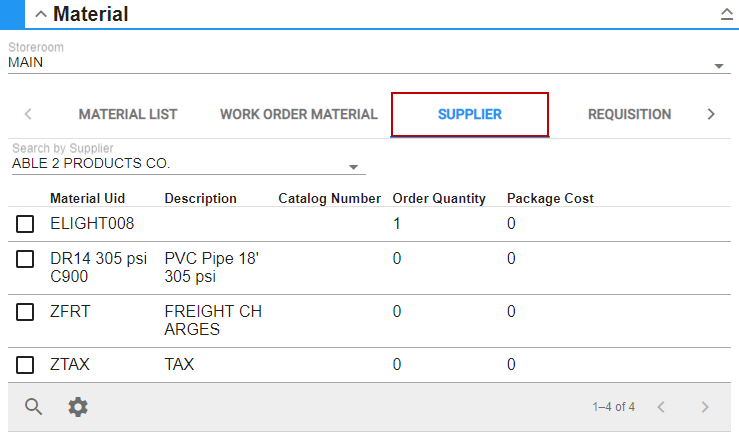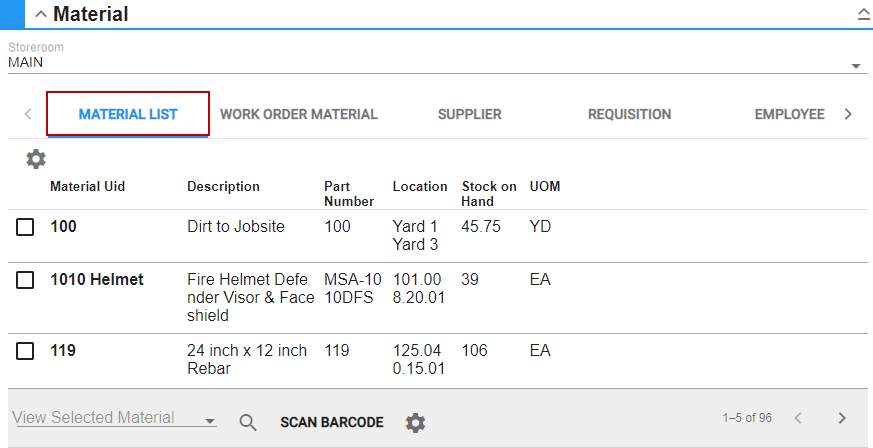 NOTE: The Material List and Material Search tabs appear when you select any transaction on the Storeroom toolbar. The Work Order Material, Supplier, Requisition, and Employee tabs only appear when specific transactions are selected.