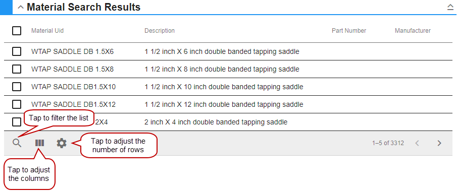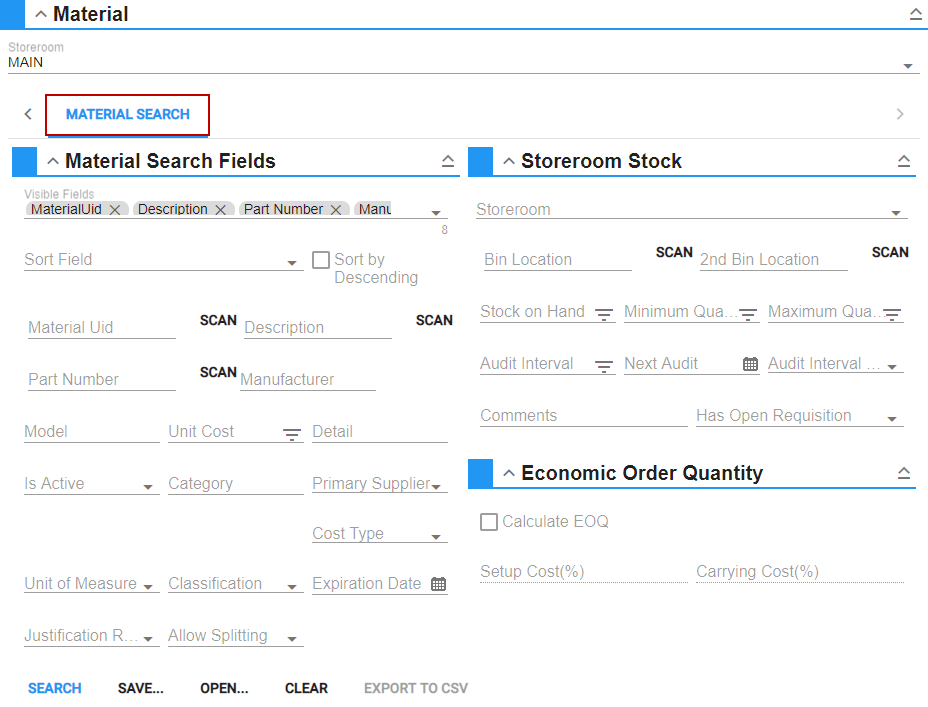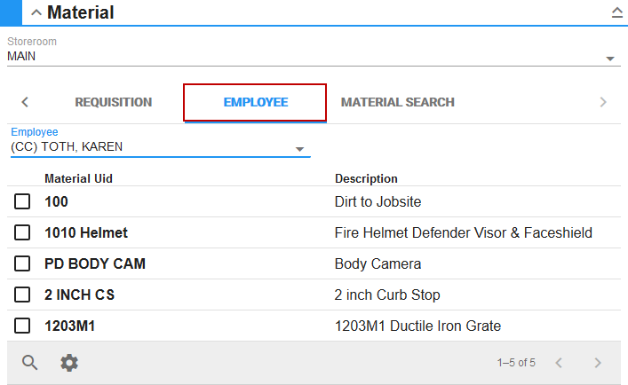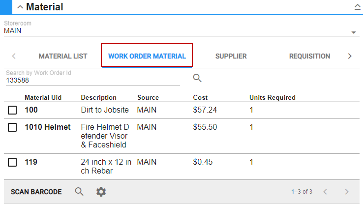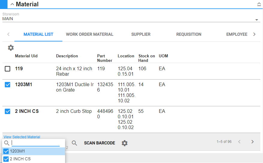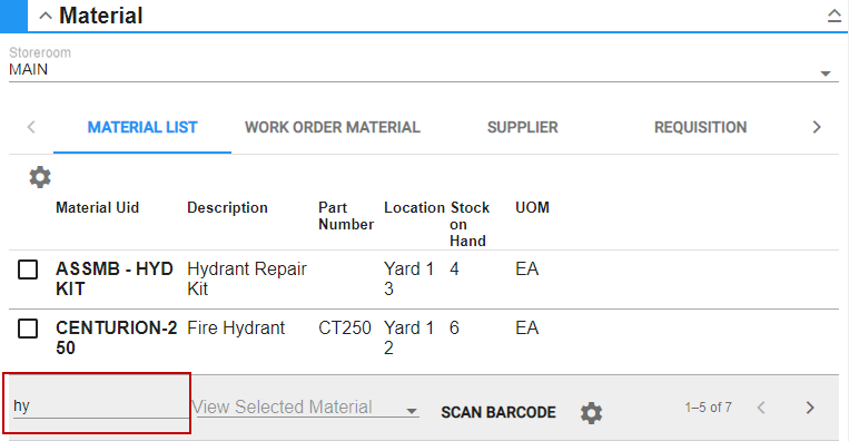 You can search materials on the Material panel by using the Material List, Work Order Material, Supplier, Requisition, Employee, or Material Search tabs. Materials can then be searched on each tab using the search icon.