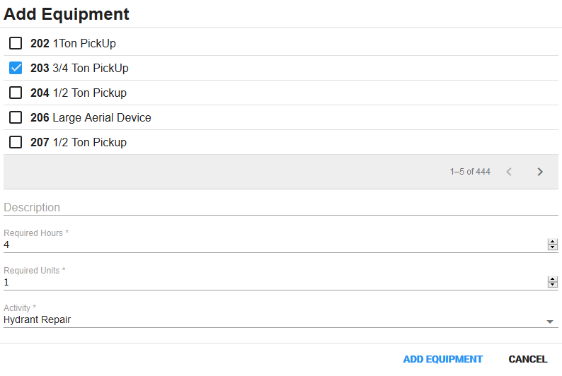 - Select equipment from the list.
