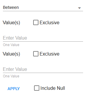 • Between: Select to search for a single number or for any numbers contained between a set. For example, return any amounts between 100 and 500.