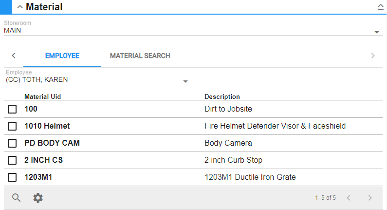 You can filter the material in the list by tapping the search icon and typing the first few letters or numbers of the material name, bin location, or part number.
