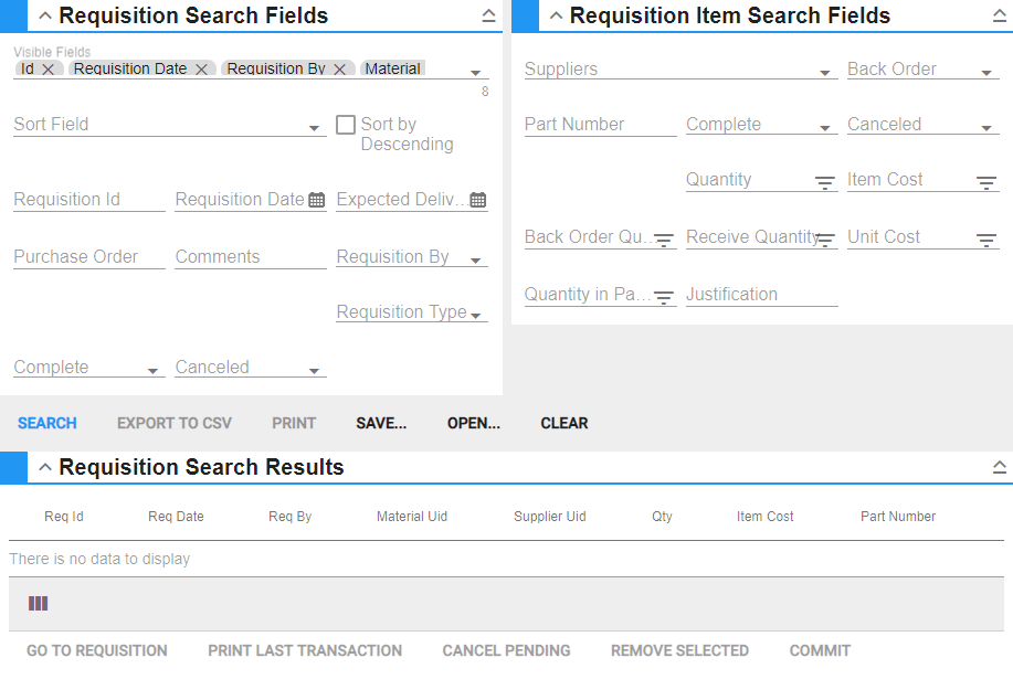 1. Search all requisitions by selecting material from the Material panel, or entering information in the Requisition Search Fields and Requisition Item Search Fields panels.