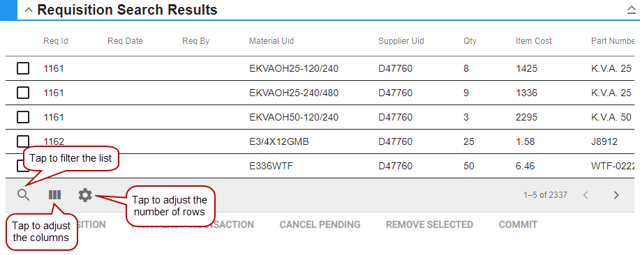 The search results will appear in the Requisition Search Results panel with the number of results listed on the panel. You can filter the material in the list by tapping the search icon and typing the first few letters or numbers of the material name, bin location, or part number.