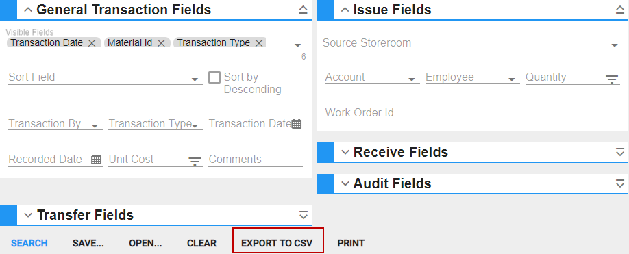 NOTE: There are subtle differences in the user interface between the transaction, requisition, and material search pages, but the functionality is the same.