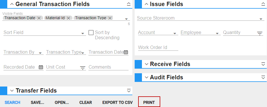 NOTE: There are subtle differences in the user interface between the transaction, requisition, and material search pages, but the functionality is the same.