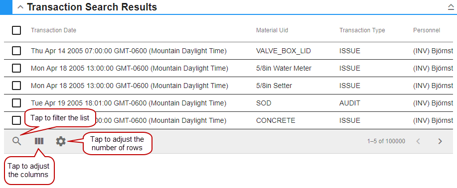 Any issue, receive, transfer, and/or audit transaction created in Storeroom can be searched for on the Transaction Search page. Search parameters can also be used to create saved searches that can be displayed in the inbox. See Save a Search for more information.