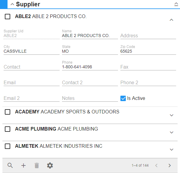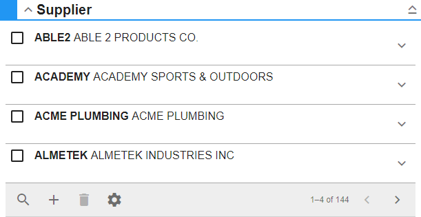 The Supplier panel contains a list of existing suppliers. You can filter this list by tapping the filter icon and typing the first few letters of the supplier name. Tap the gear icon to adjust the number of rows shown in the panel. The number set in this panel, will persist on all other administrative pages.