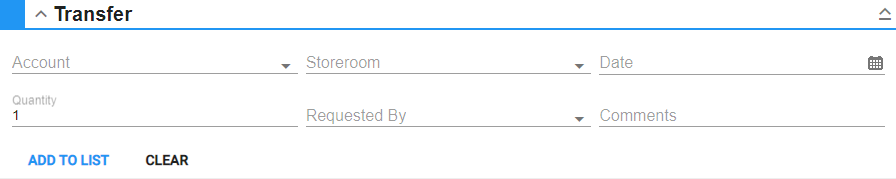 The Transfer panel is used to move materials from one storeroom to another.