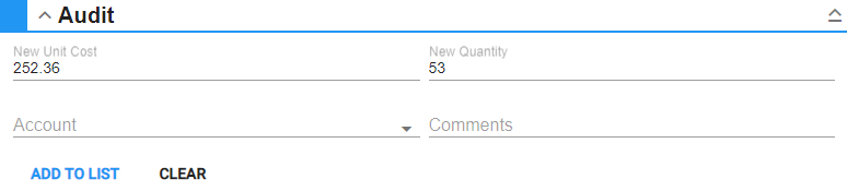 1. Enter the information in the Audit panel to audit the material, including the New Quantity and/or New Unit Cost if those values have changed.