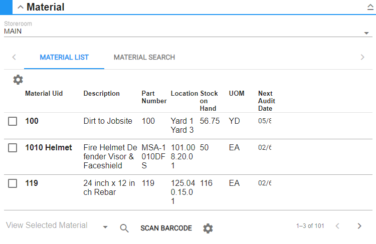 1. On the Material panel, select a Storeroom from the drop-down list. This changes the list of materials. Materials can only be selected from one storeroom at a time.