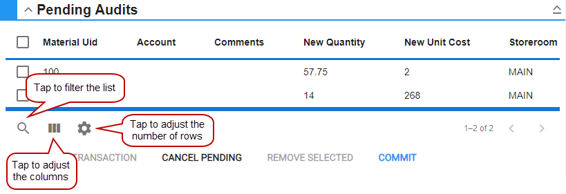 • Tap the gear icon to adjust the number of rows shown in the panel. The number set in this panel will persist on all other transaction pages for the corresponding pending material panel.