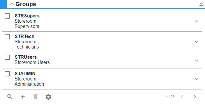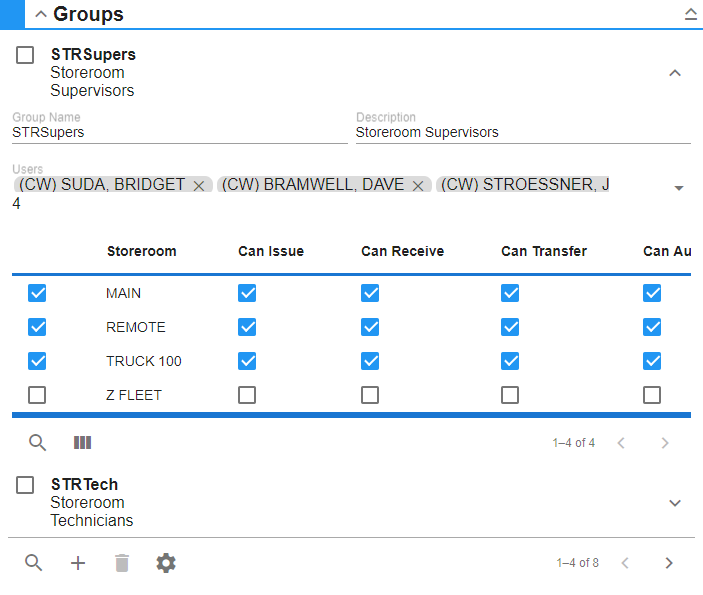 The rights of the group display for the listed storeroom(s) under the Users field.