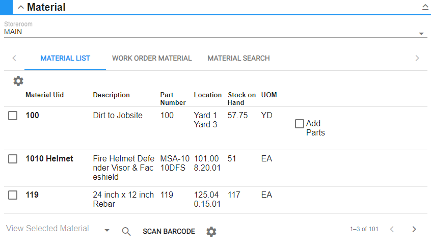 2. On the Material panel, select a Storeroom from the drop-down list. This changes the list of materials. Materials can only be selected from one storeroom at a time.