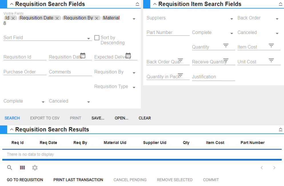 1. Search all requisitions by selecting material from the Material panel, or entering information in the Requisition Search Fields and Requisition Item Search Fields panels.