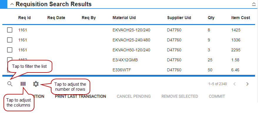 The search results will appear in the Requisition Search Results panel with the number of results listed on the panel. You can filter the material in the list by tapping the search icon and typing the first few letters or numbers of the material name, bin location, or part number.