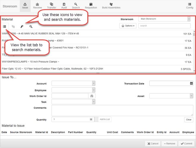 The Issue, Receive, Transfer, Audit, Search, Requisition, and Build Assemblies pages are split into two panels, the Material panel and the bottom panel that changes depending on the transaction being performed. The Material panel includes materials from the storeroom selected and can be used to select material in a variety of ways on all of these pages.