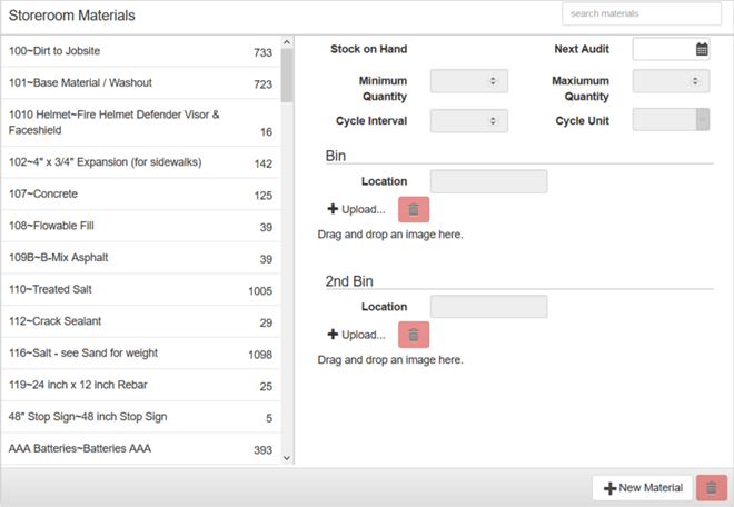 When adding a material, the Stock is 0 and cannot be changed here. The stock must be changed in Storeroom through an Audit or Receive transaction. See Perform an Audit or Receive Material for more information.