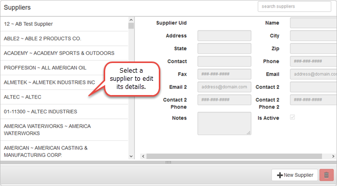 The Suppliers section on the left contains a list of existing suppliers and on the right shows the supplier details. The details cannot be edited unless a supplier has been selected. You can filter this list by typing the first few letters of the supplier in the search box in the top-right corner of the panel.