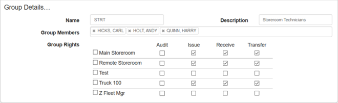 • Storerooms must be created before defining groups rights under Config > Storeroom Materials. See Add or Edit a Storeroom for more information.