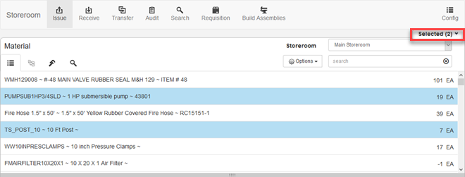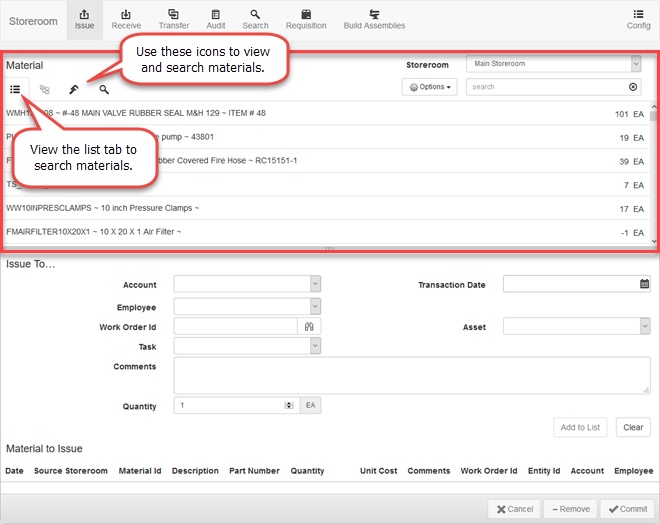 The Issue, Receive, Transfer, Audit, Search, Requisition, and Build Assemblies pages are split into two panels, the Material panel and the bottom panel that changes depending on the transaction being performed. The Material panel includes materials from the storeroom selected and can be used to select material in a variety of ways on all of these pages.