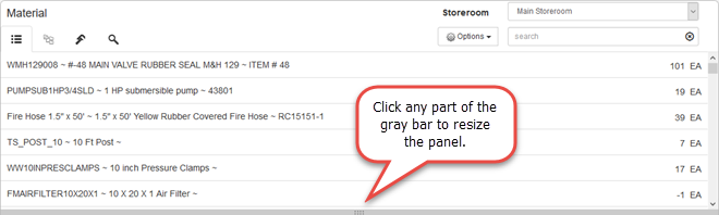 Use the Storeroom drop-down list, on the right side of the Material panel, to choose which storeroom you want to view or work in.