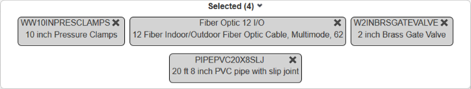 When material items are selected, a Selected drop-down arrow appears in the top-right corner.