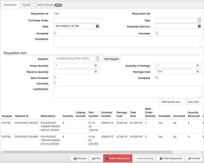To delete a requisition, perform a requisition search. See Search for a Requisition Transaction for information on performing a requisition search.