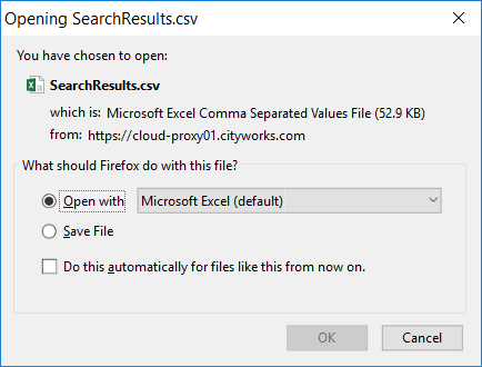 - On the Opening SearchResults.csv panel that appears, click Open with to view the results or Save File to save them.